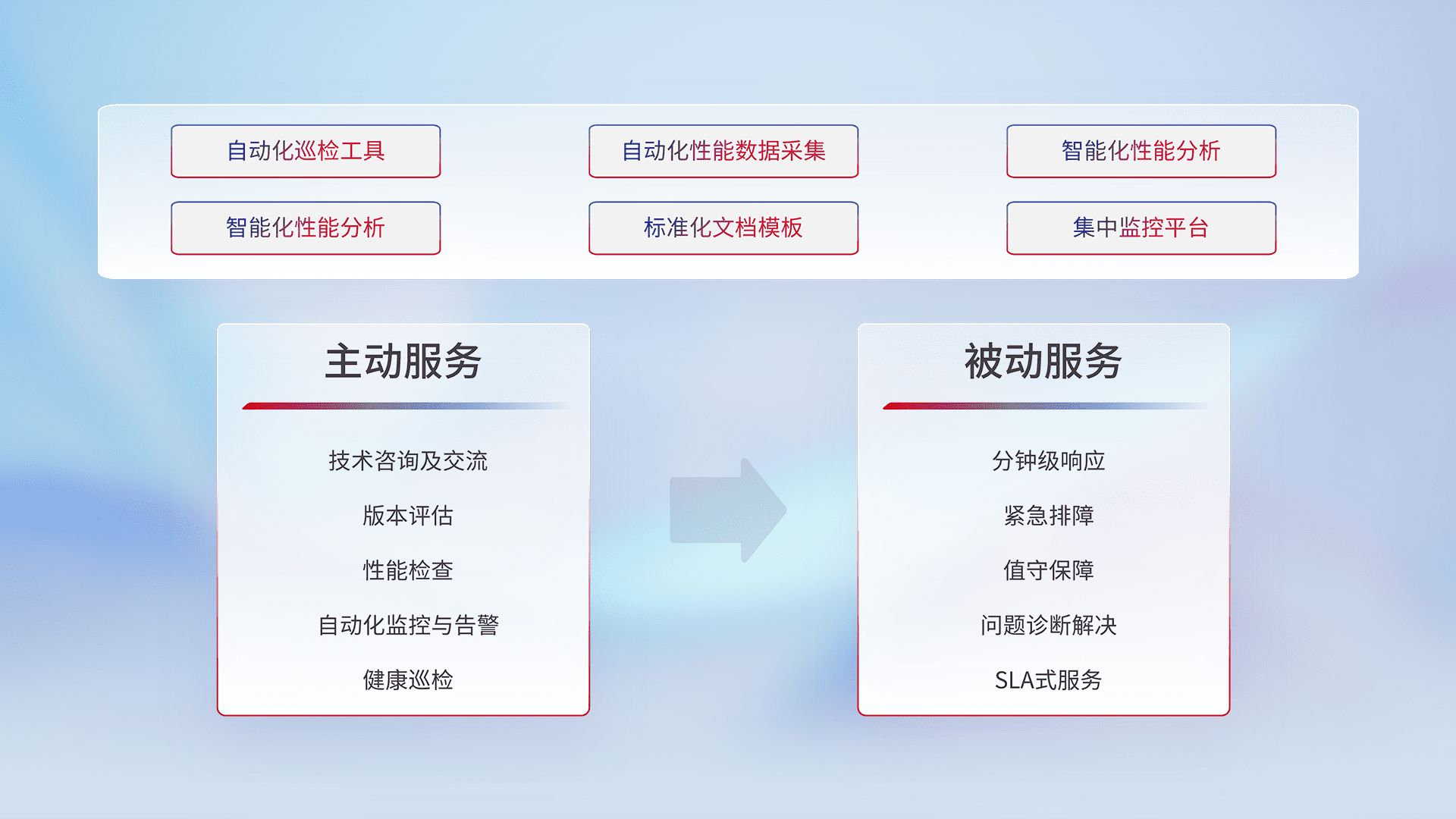 智能化工具和标准化文档,,,,保障服务质量,,,,提供主动服务(包含技术咨询、、版本评估、、、性能检查、、、自动化监控与告警、、、、健康巡检)和被动服务包含(分钟级响应、、、紧急排障、、值守保障、、、问题诊断解决、、、、SLA服务)。。